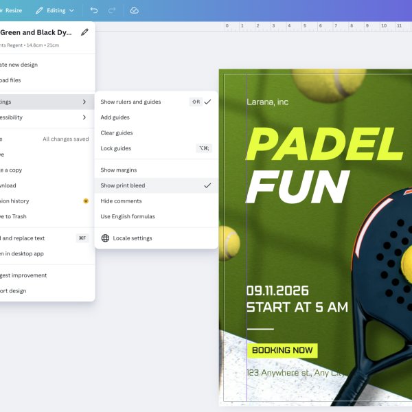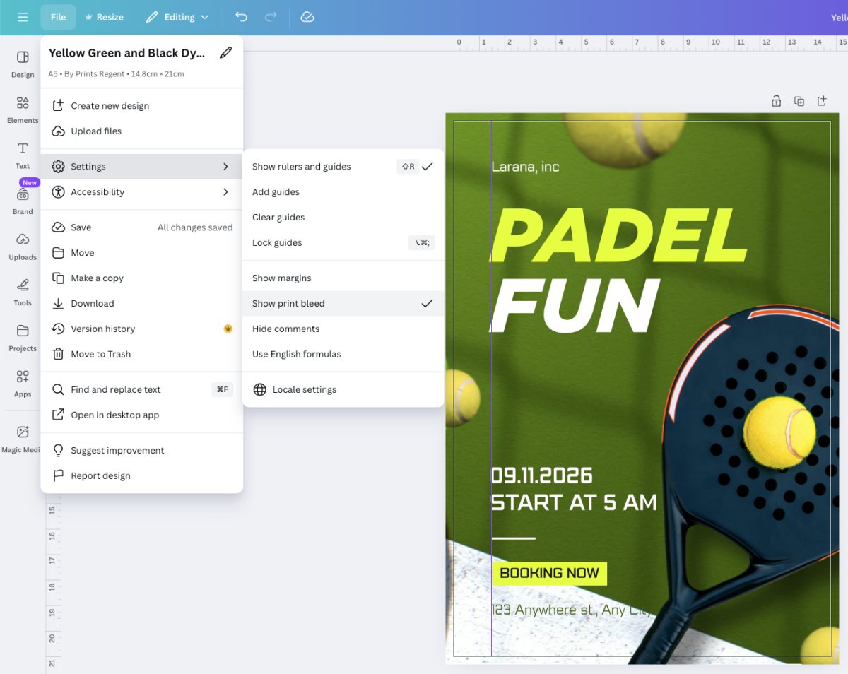 We also recommend changing the settings, found under File > Settings, to show rules, guides and bleed. We see so many documents where text elements have been randomly placed on the page and are not aligned, which is not a good look!