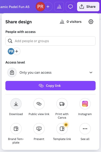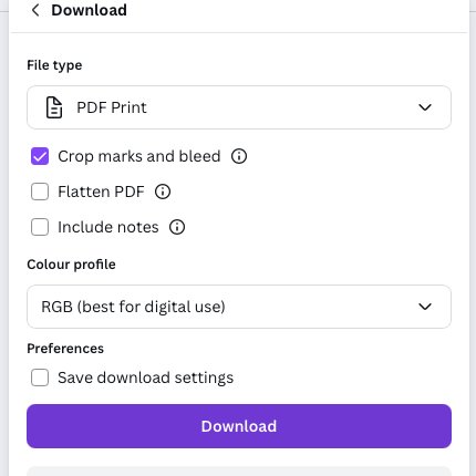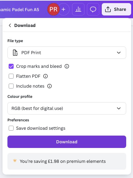 If you want to generate your own print-ready file, click on the Share button in the top right, and then Download. You can also use the Share button to send us an editable link to printed@printsregent.com and we will do the hard work for you.