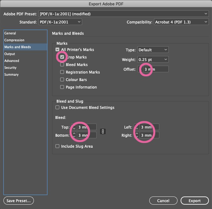 - Ideally include crop/trim marks if your software allows. These should be offset by 3mm (any closer to the page edge and it defeats the object of the bleed). Please extend the bleed area to allow for any manually placed marks which need to be added, such as for folding or perforating.